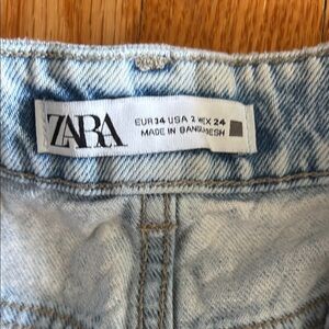 Trendy light blue jean shorts by Zara. Features a stylish distressed hem. Perfect for casual wear.