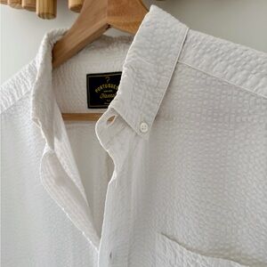 Very high-quality white seersucker shirt with button down collar from Portuguese Flannel. 100% cotton. Made in Portugal. Perfect for warmer weather or resort vacations.