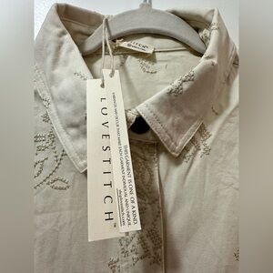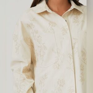 An embroidered cotton shirt jacket with a snap button front.