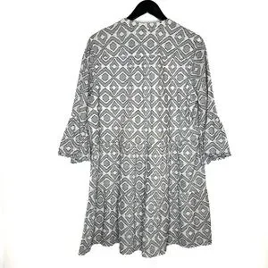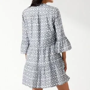 Stylish mini dress with geometric pattern. Features flared sleeves and V-neckline. Perfect for casual outings.