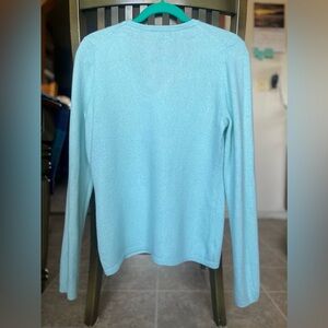 Super soft and warm v-neck 100% cashmere sweater. Color: super light aqua. Great for layering.