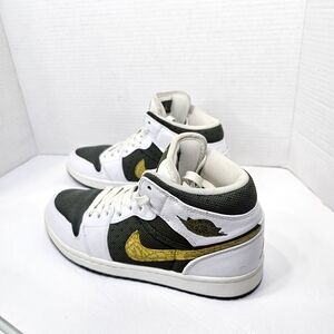 Elevate your look with these Jordan sneakers. Classic white and black with striking gold details. Ideal for casual wear.