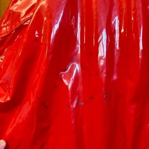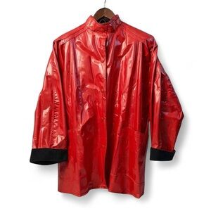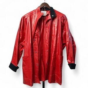 Bold red trench coat with glossy finish. Features black cuff accents. Stylish and eye-catching.