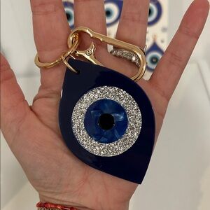 This stylish evil eye keychain features a deep blue design with sparkling silver details, complemented by gold hardware. Perfect for adding a touch of elegance to your accessories.