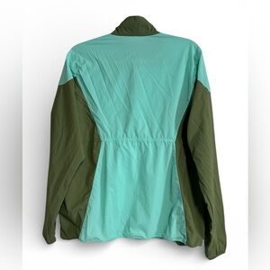 Chic pullover with aqua body and olive accents. Thin material Quarter zip. Front zip pocket. Price reflects 3 very faint pen marks on front left visible with closeup only. 24” across chest. Length 27”.