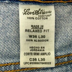 Levi Strauss Signature relaxed fit straight leg jeans have 5 pocket styling, zipper & button closure, material - 100% cotton, size 36 X 30. Jeans are gently used in good condition.