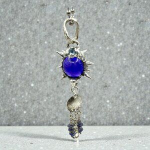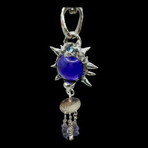 This pendant tells tales of elegance and mystery. A vintage cobalt glass marble takes center stage, surrounded by quartz, lapis lazuli, and crystal accents. The artisan’s touch breathes life into this one-of-a-kind creation, blending timeless beauty with intricate craftsmanship. A treasure for those drawn to unique narratives in jewelry.