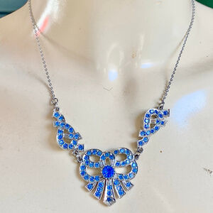 This unique necklace features a silver-tone metal chain with a central pendant and two side embellishments, all adorned with blue rhinestones. The central pendant is shaped like a bow with a larger blue rhinestone at its center, flanked by fan-like segments. The side pieces have an intertwined ribbon design. The reverse of the pendant shows open-backed settings for the rhinestones. The necklace has a spring ring clasp closure. In great condition for age, measures approximately 18 inches.