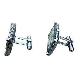 These vintage cufflinks by CYARD feature a detailed horse motif with a textured border. Crafted in sterling silver, they evoke timeless elegance and charm.