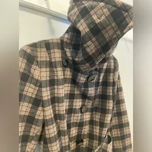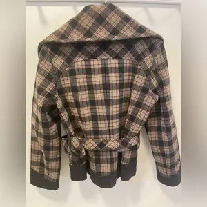 Tartan black and tan jacket with belt and black buttons.