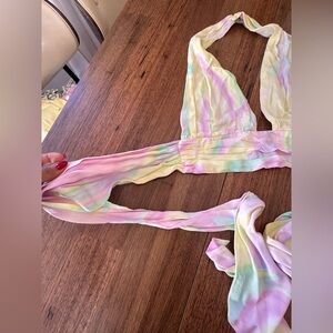 Vibrant halter top with tie-back. Features a mix of pastel shades for a trendy look.