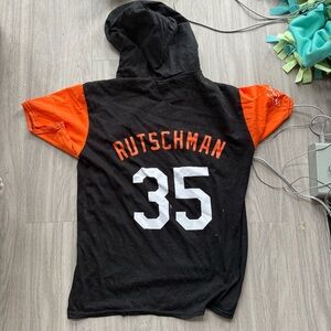Stylish Baltimore Orioles tee shirt hoodie with bold lettering. Features a vibrant orange hood and sleeves. Perfect for casual wear. Rutschman on back