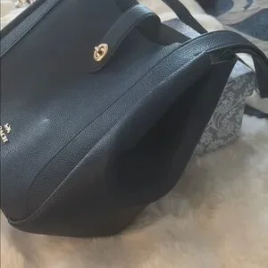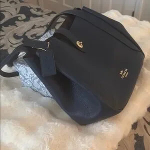 Sophisticated Coach tote in dark blue leather. Features a classic design with gold accents. Ideal for everyday use.