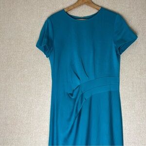 Step into classic sophistication with this stunning St. John Milano Knit dress in a rich teal hue. Made from the brand’s signature structured-yet-stretchy knit, this piece offers a tailored silhouette with a flattering waist detail.