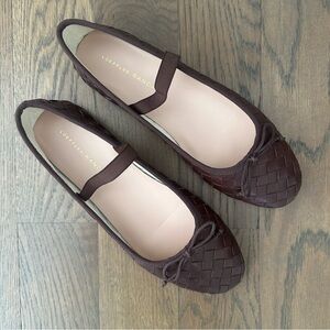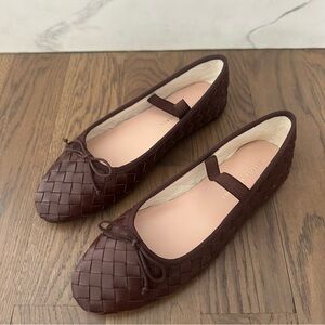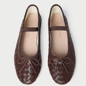 New Loeffler Randall Leonie woven leather soft ballet flats. In espresso, a rich chocolate brown. Soft ballet flat in espresso brown woven leather with an elastic bridge strap and bow detail. Features a padded footbed with gold stamped logo and an almond toe. Slips on. Add a fun textural element to any look in this bow-topped ballet flat with a woven leather upper and elasticized mary jane strap. Upper is cow leather, outsole is bovine leather. Size 7.5B. Outsole measures 9 7/8" long, 3 1/16" wide at widest. Insole measures 9.5" long. A great balletcore preppy flat shoe. Brand new, never worn, slight marking at sole from pricing. No box.