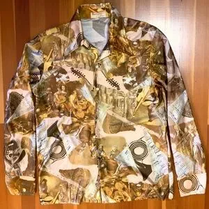 Graphically striking 100% POLYESTER shirt from the Disco era. This one has a golden sheen and spread collar. I only collected pieces with amazing designs and colors. The technological process used to print these 1970s phenomena allow photographic quality reproduction not seen before on other fabrics. Most of my shirts came from California. That is why they are so edgy.