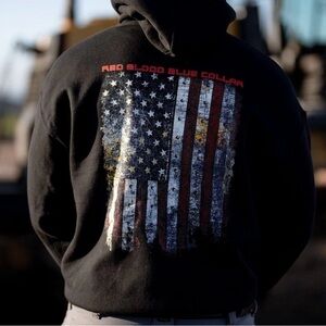 Bold black hoodie with a distressed American flag graphic. Comfortable and stylish for any occasion.