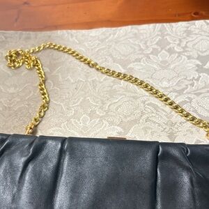 Sophisticated black leather clutch. Features elegant gold clasp. Perfect for any occasion.