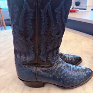Elegant dark blue ostrich boots. Intricate stitching. Perfect for a bold look.