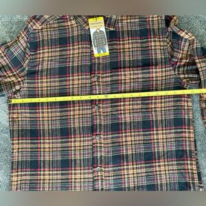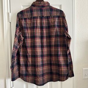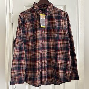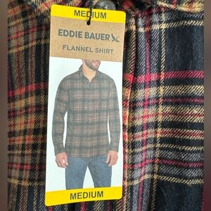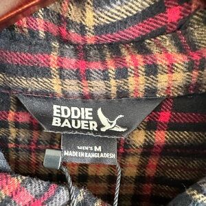 On offer is a Men's Night Sky Ohio Plaid Relaxed Fit Flannel Shirt, size Medium, from Eddie Bauer. The item is new with tags, see the photos for measurements and additional detail on condition. It is made from 100% cotton.