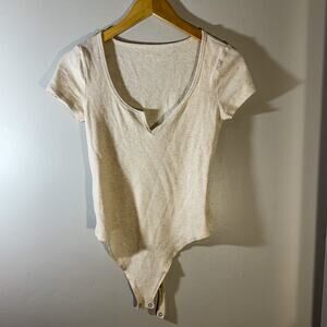 Aerie Ribbed T-Shirt Bodysuit | Split V-Neck Cutout & Neutral Beige Heather | M