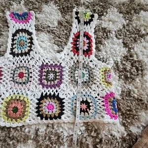 This Crochet Granny Square Top is a bohemian-inspired piece perfect for women who love the Festival or Hippie style. The sleeveless top features a square neckline and pullover closure, making it easy to wear for various occasions like travel, parties, or casual outings. Made from lightweight and breathable crocheted acrylic fabric in multicolor, this cropped top is ideal for the summer, fall, and spring seasons. The wide straps and comfortable regular fit add to the overall cozy and bohemian vibe of this unique top. Hand wash only to keep this colorful and eclectic piece looking fresh.