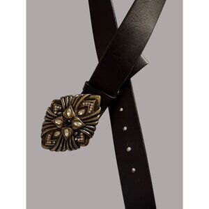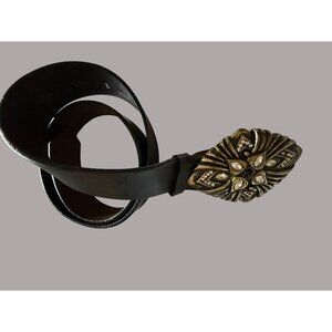 Vera Pelle Vintage Made In Italy Black Leather Belt Ornate Gold Buckle Inlays