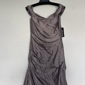 La Femme Off the Shoulder Satin Evening Dress with Pleating size 10 New with tags. Platinum color. Timeless off the shoulder satin evening gown with beautiful pleated detail and a detailed neckline. Back zipper closure.