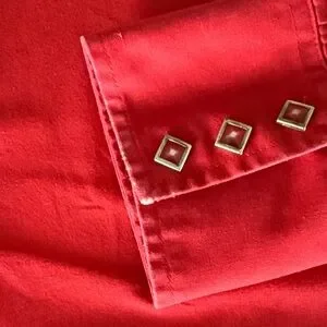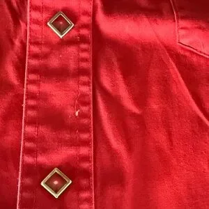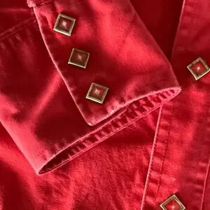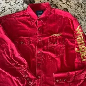 Vintage crimson red Wrangler Rodeo Pearl snap. See pictures for imperfections. Used old school western. Fits like a Large tag is worn that says size