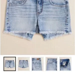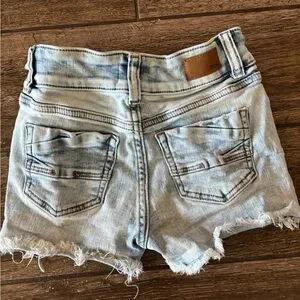 Trendy BKE (Buckle) jean shorts with frayed edges. Light blue wash. Stretchy, adjustable around the waist super cute pair of jeans! In excellent condition!