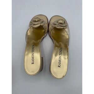 Elegant Ramon Tenza slide sandals in gold with a leather floral accent and clear strap. Made in Spain with a leather sole. Size 8N. Comes with original box and tissue paper.