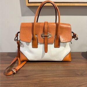 Dooney & Bourke Elisa Pebble Leather Satchel. 13x12x6. Excellent used condition! Beautiful emerald green interior. Exterior is white and tan leather.