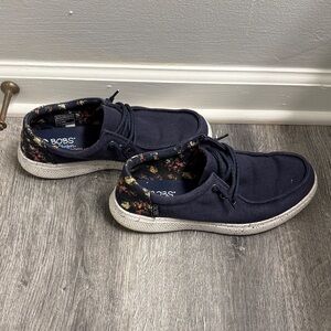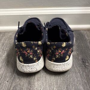 Navy blue loafers with a floral designed heel. Comfortable and stylish for everyday wear.