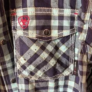 Stylish Ariat shirt with a teal and navy checkered pattern. Features a button-up design and dual chest pockets.