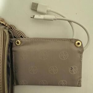 Don't get caught out & about with no phone - carry your ultra-thin phone charger in your RFID secure wallet! Features: Metallic gold leather, Top zip, 6 card slots, RFID lining, removable strap, and a universal USB powerbank. Charge your phone on the go! Includes iPhone and android adapters. Powerbank is working (see red indicator light on in photos) and chargeable with a USB. Very good used condition with some minor scuffs on the front. Measures: 8.5" x 5.25" x .5" with a 7" strap.