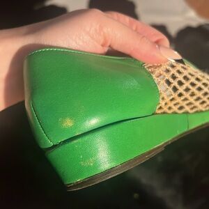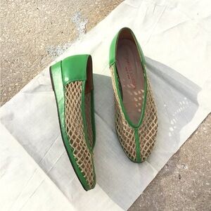 Vintage CHARLES JOURDAN Mesh Fishnet Raffia Slippers Wedge Flats Green Leather