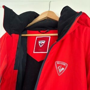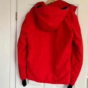 Bold red jacket with sleek black details. Includes a hood and secure zip closure. Ideal for skiing adventures.