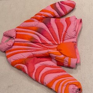 Eye-catching puffer jacket with bold pink and red design. Perfect for staying warm in style.