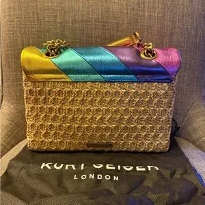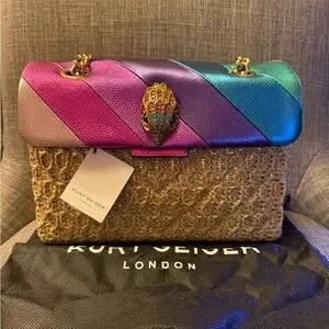 Kurt Geiger London Kensington Rainbow Raffia Crossbody Bag, specifically a mixed-material design featuring a metallic rainbow leather flap and a woven straw or raffia body. The Kensington collection is characterized by its signature crystal-embellished eagle head clasp and diagonal striped patterns. While the metallic rainbow leather is a classic Kurt Geiger motif, this particular version combines it with a textured, neutral-toned base, making it a unique summer-ready variation of the style.