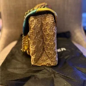 Hardware: It features a gold-tone pull-through chain strap that can be worn doubled for a shorter drop or extended for a crossbody fit, and the brand's signature crystal-embellished eagle head on the front flap.