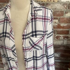 Beach Lunch Lounge White Purple and Blue Plaid Button Down Shirt Size XS