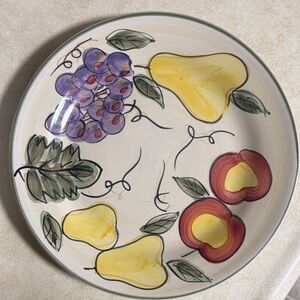 Vibrant dinner plate with fruit design. Features grapes, pears, and apples. Perfect for dining decor. Looks brand new. 11” wide. Will handle and package with care