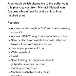 The Michael Kors Plus Size X Cheetah Print Faux-Fur-Trim Hooded Vest in pink is a stylish and versatile outerwear piece perfect for the fashion-forward woman. Made from polyester with faux-fur trim accents, this mid-length vest features a zip closure and a hood for added warmth and protection. Ideal for travel, casual outings, or business settings, the animal print pattern in pink adds a pop of color to any outfit. With its high-quality construction and on-trend design, this vest is a must-have for the winter, fall, and spring seasons.