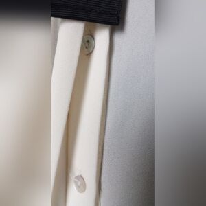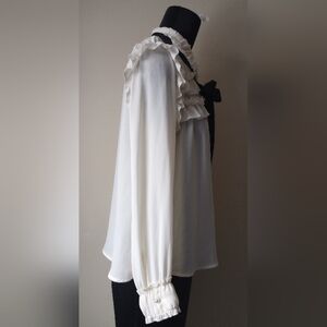This elegant cream blouse features delicate ruffles and a stylish black bow, perfect for any occasion. Its sophisticated design adds a touch of class to your wardrobe.