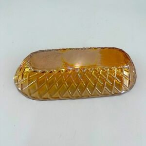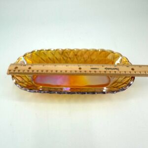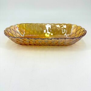 The Vintage Indiana Glass Marigold Carnival Glass Pretzel Pattern 10" Serving Bowl is a beautiful piece that exudes Mid-Century Modern style. Originating from America in the 1960s, this gold glass bowl features an oval shape with a decorative pretzel pattern, making it perfect for all occasions. With a glossy finish and an original production style of Carnival Glass, this bowl is a unique addition to any table setting. Hand wash only to preserve its vintage charm.