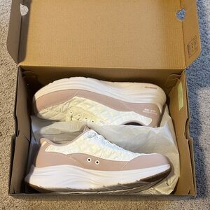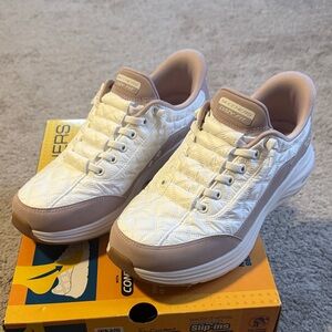 Stylish and comfortable Skechers slip-ons. Light pink and white design. Perfect for casual outings. Brand new in the box.