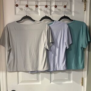3 Old Navy stylish and comfortable cropped short sleeve tees. Includes green, gray, and cream colors. Perfect for everyday wear. Subtle snag on back of green shirt. Gently worn!