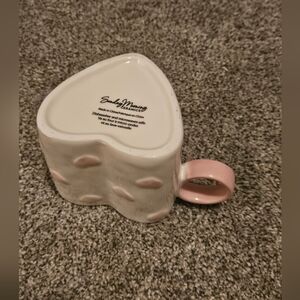 Enjoy your favorite beverage in this charming heart-shaped mug. Featuring a delightful pink and white design, it's perfect for adding a touch of love to your dining experience.