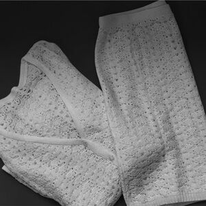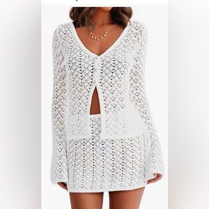 Crochet set two piece hollow out design, long bell sleeve button down shirt with shell button detail slim fit, matching high waisted mini skirt, simple and trendy
