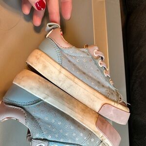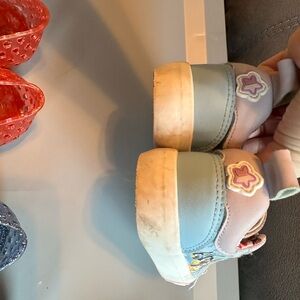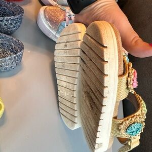 Vibrant set of kids' sandals and sneakers. Includes glittery red, blue, and yellow jelly shoes. Features colorful sandals with floral accents and shiny sneakers. Mild to moderate wear in pictures. Good for kids to play in